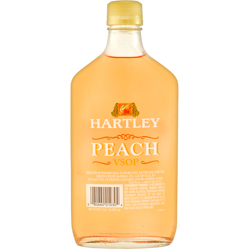 Hartley Peach brandy is ripe for the sipping. Its a smooth, balanced brandy mixed with peach liqueur, making it a unique twist on classic. With notes of vanilla spice and juicy, fresh peach flavor. Finishes smooth and always satisfies. 27% ABV, 54 Proof